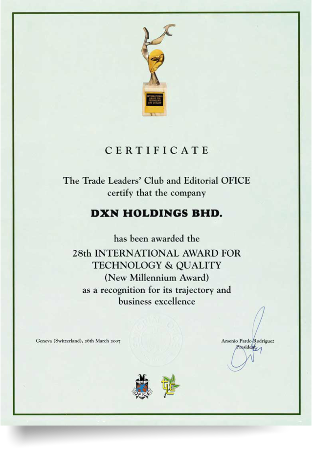 Los dirigentes sindicales Club y Editorial OFICE certifica que DXN Participaciones Bhd, DXN Farmacéutico Sdn. Bhd, DXN Industries (M) Sdn. Bhd, DXN Biocombustibles Sdn. Bhd y DXN Oleochemicals Sdn. Bhd ha sido galardonado con el Premio 28a Internacional para la Tecnología y Calidad (New Millennium Award) por su trayectoria y excelencia empresarial.